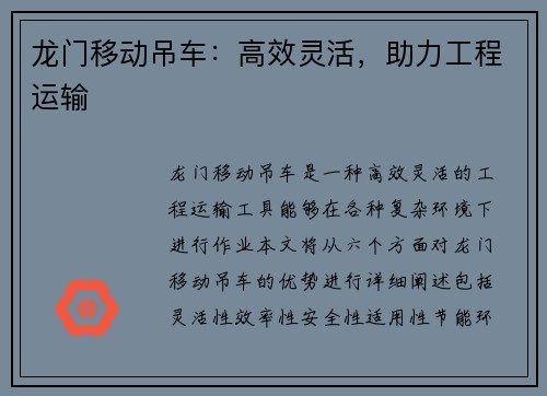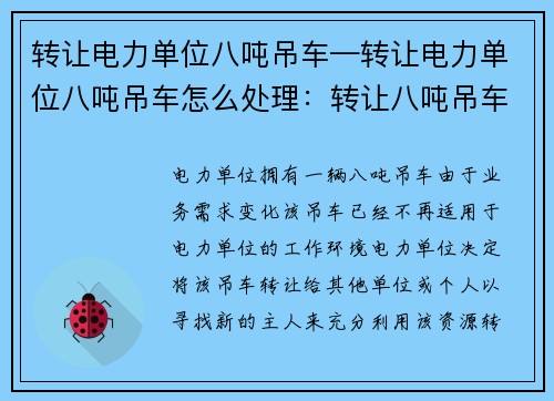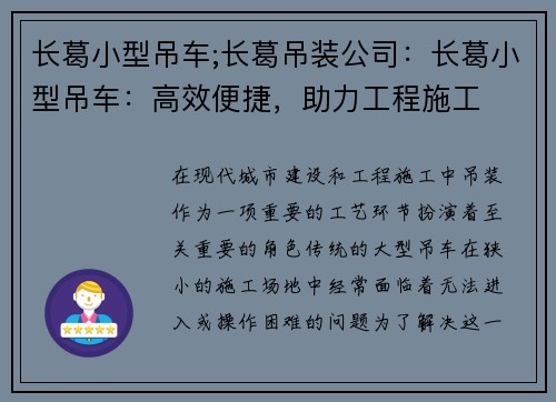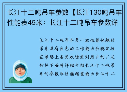 文章 本文将详细阐述骏通12吨吊车参数【俊通8吨吊车:卓越性能引领行业】的六个方面。我们将介绍其卓越的起重能力和稳定性。我们将探讨其出色的操作性能和灵活性。然后,我们将分析其高效的动力系统和节能环保特...